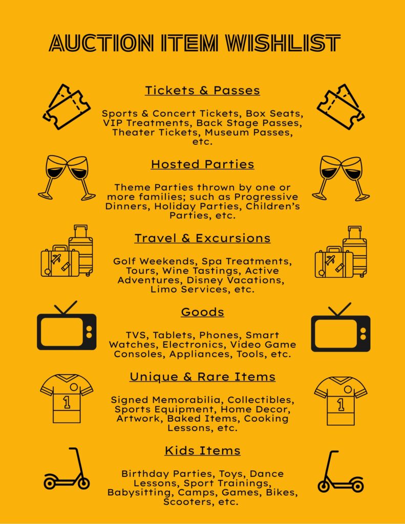 The next part of auction planning is gathering sponsors and auction items that will help make this event a huge success. We’re asking for your help with: